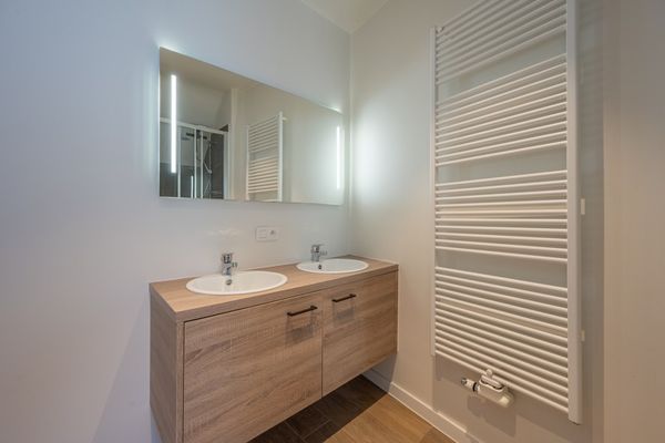 Op de eerste verdieping bevinden zich twee ruime slaapkamers en een stijlvolle badkamer, uitgerust met een dubbele wastafel, douche en toilet.